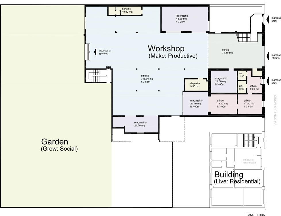 The site consists of 3 main components: officina (workshop), palazzina (residential building), and the garden. Each area mixes three key aspects of ‘making’: do, live, grow.